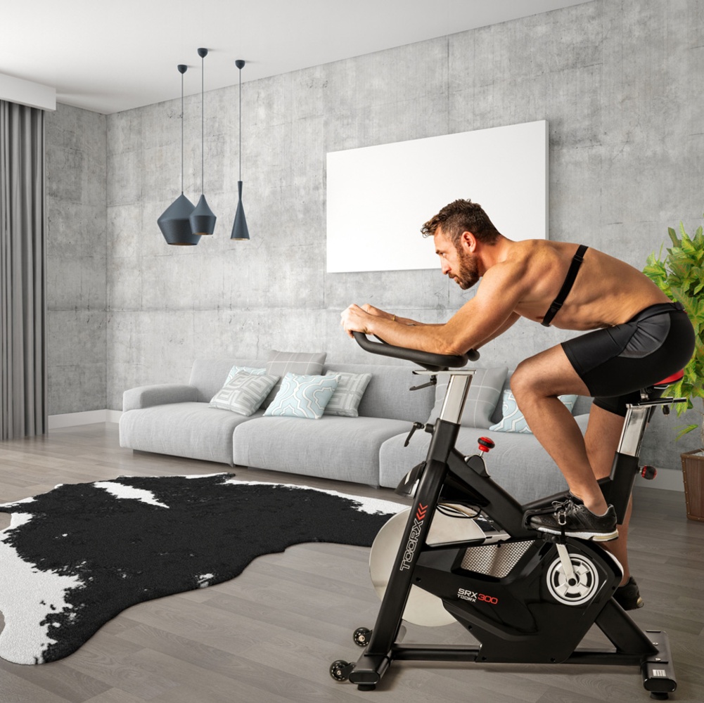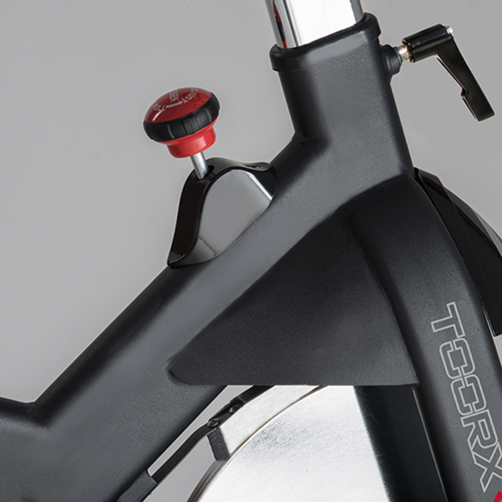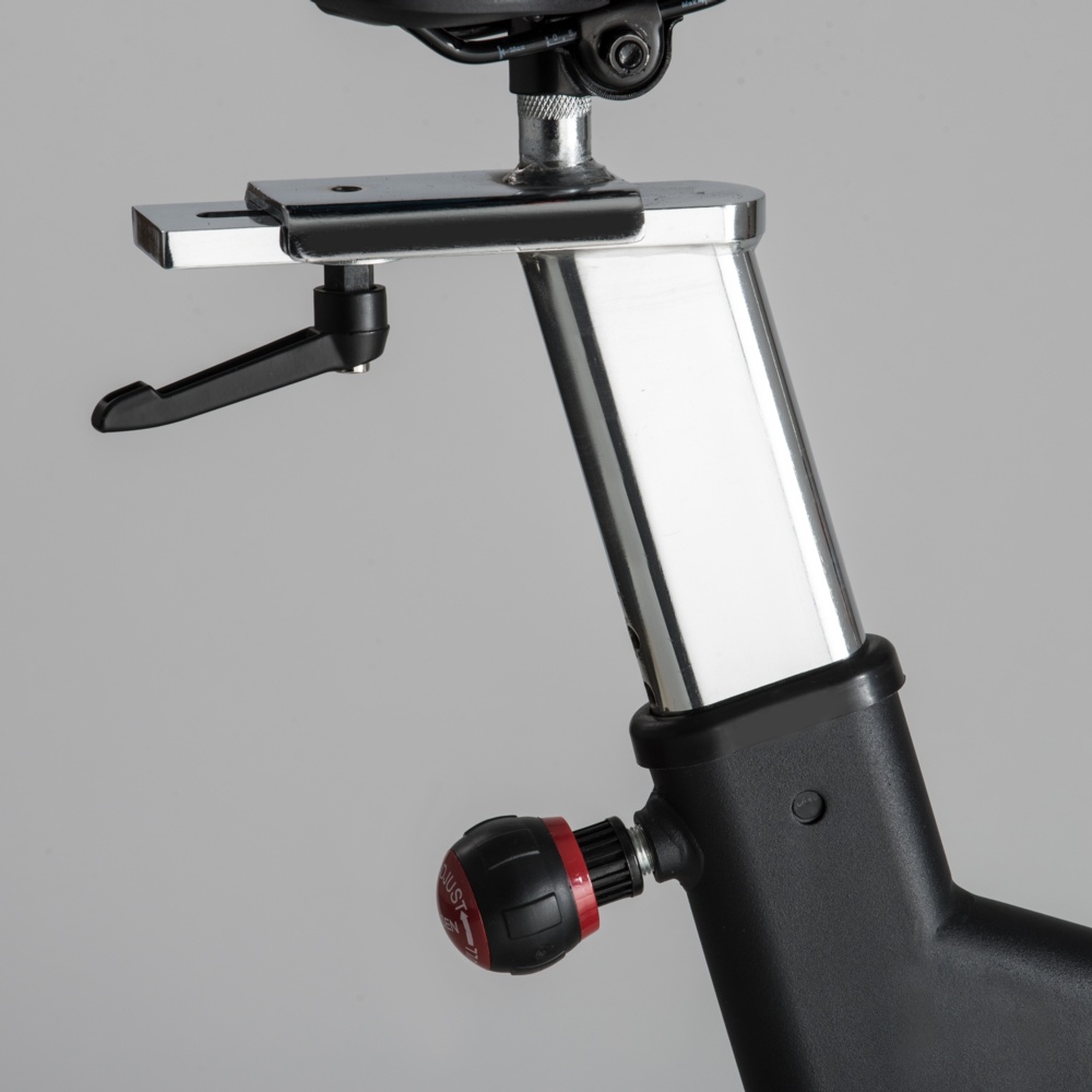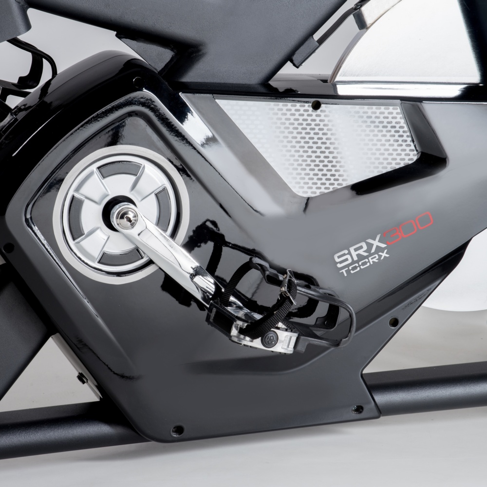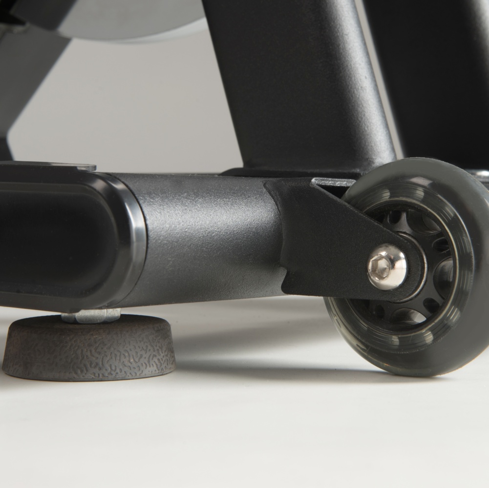 Trasmissione a cinghia con pignone fisso. Sistema di frenaggio magnetico con regolazione elettronica dello sforzo e freno a tampone di sicurezza. Dotato di leva di sicurezza per il bloccaggio rapido del volano. Massa volanica peso 24 kg, lavorato CNC e bilanciato. HRC-HEART RATE CONTROL. Ricevitore wireless integrato e fascia cardio inclusa. APP READY. iConsole+App (inclusa). Kinomap Fitness App (compatibile).