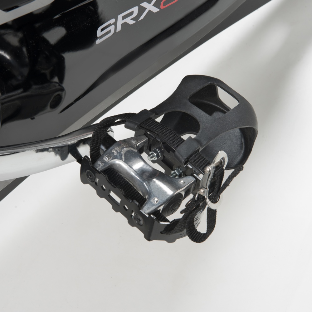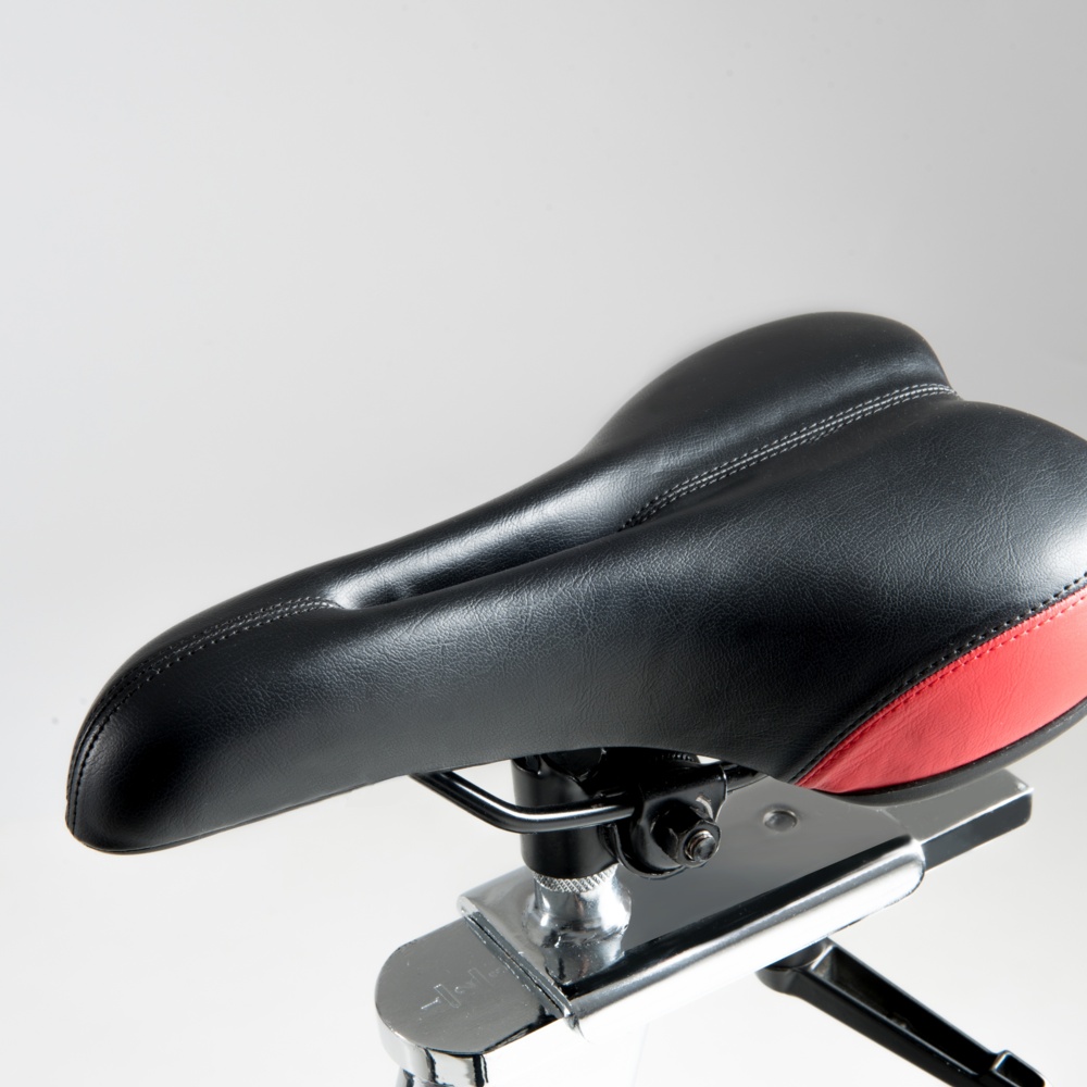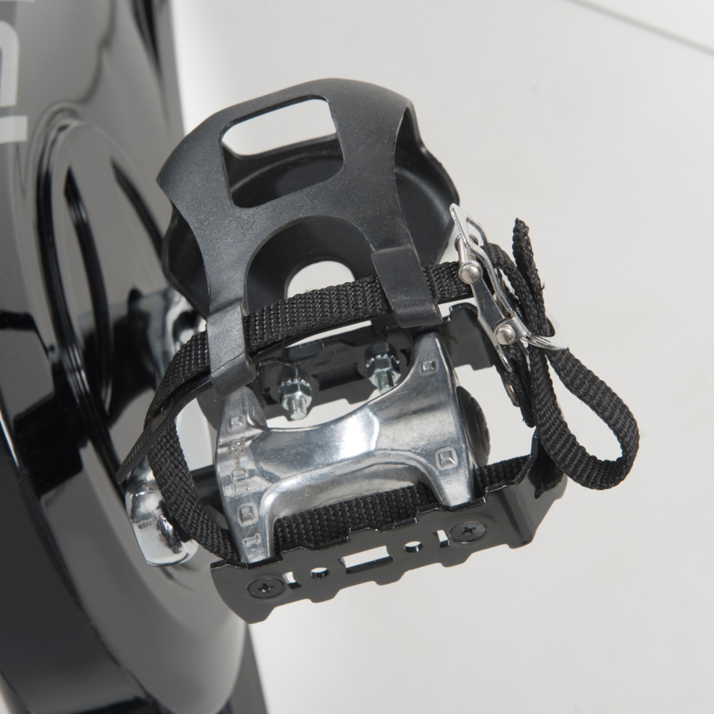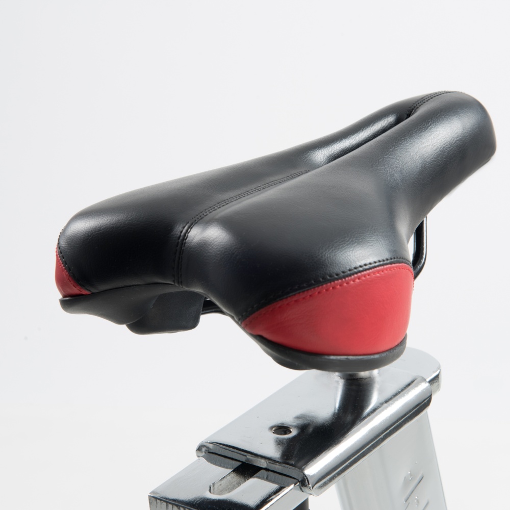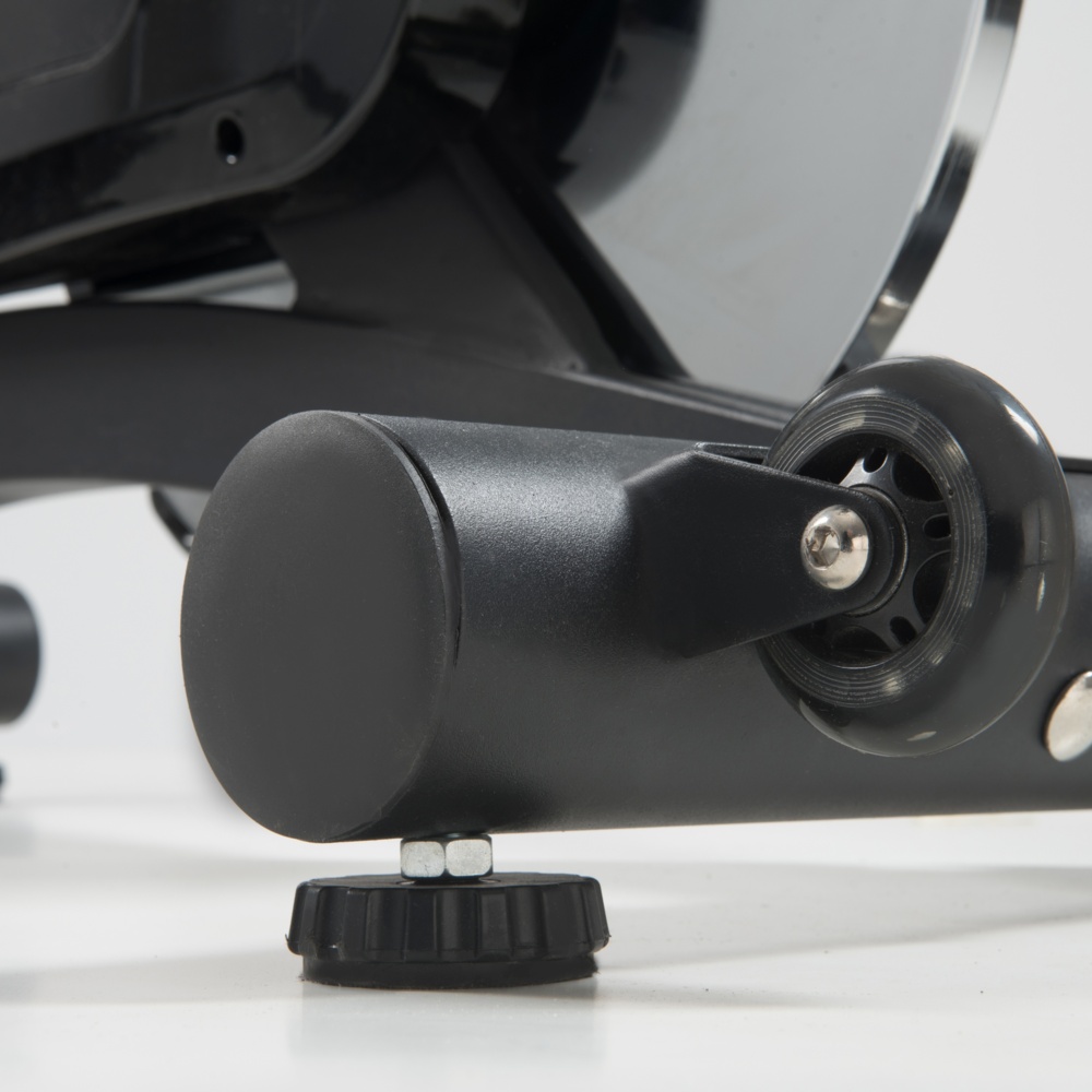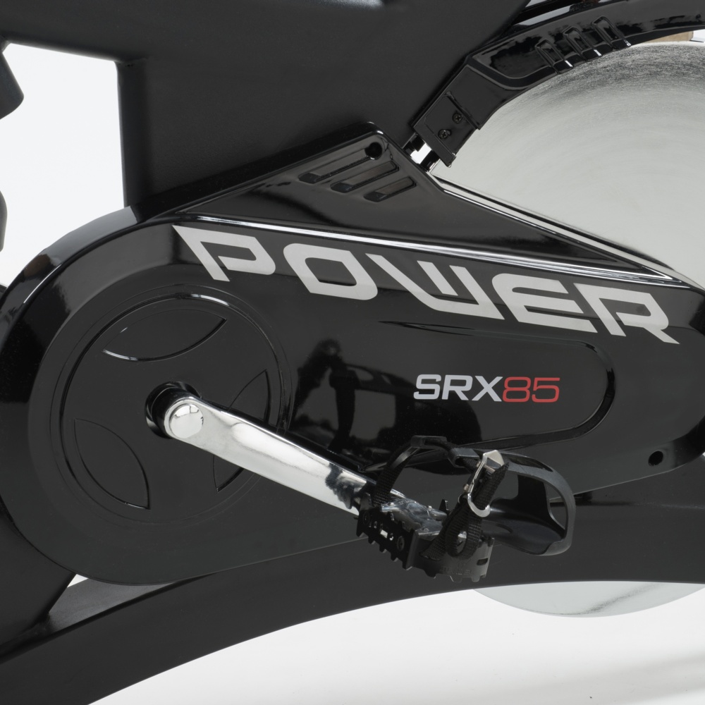Trasmissione a cinghia con pignone fisso. Sistema di frenaggio a tampone con feltri. Leva di sicurezza per il bloccaggio rapido del volano. Massa volanica peso 24 kg lavorato CNC e bilanciato. Ricevitore wireless integrato e fascia cardio inclusa.