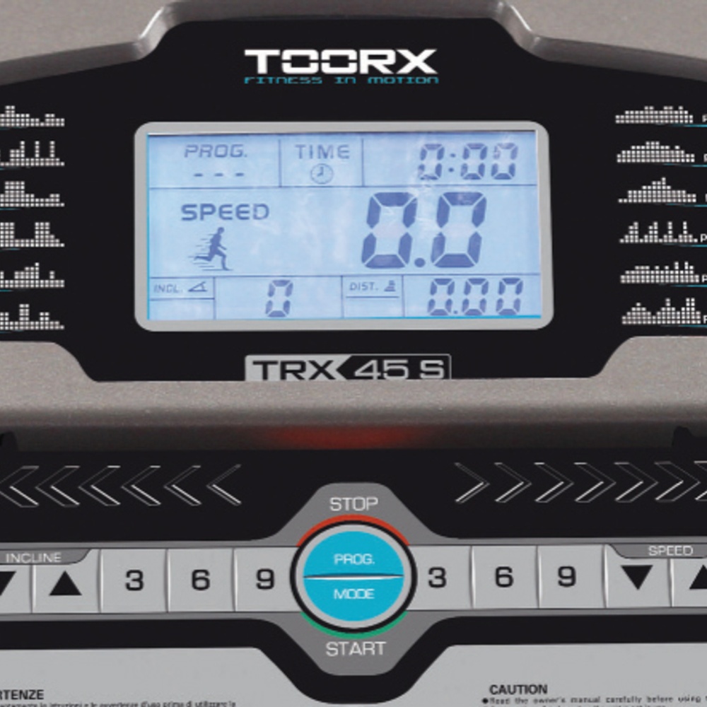 velocità inclinazione - frequenza cardiaca - distanza - tempo - consumo calorico - programma in esecuzione |