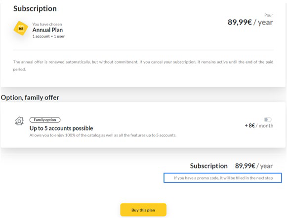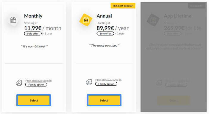 Cliccando su "Il mio abbonamento", la pagina ti reindirizzerà automaticamente alla pagina di presentazione dei prezzi. Per i pacchetti mensili o annuali, clicca su "seleziona" sotto il pacchetto desiderato