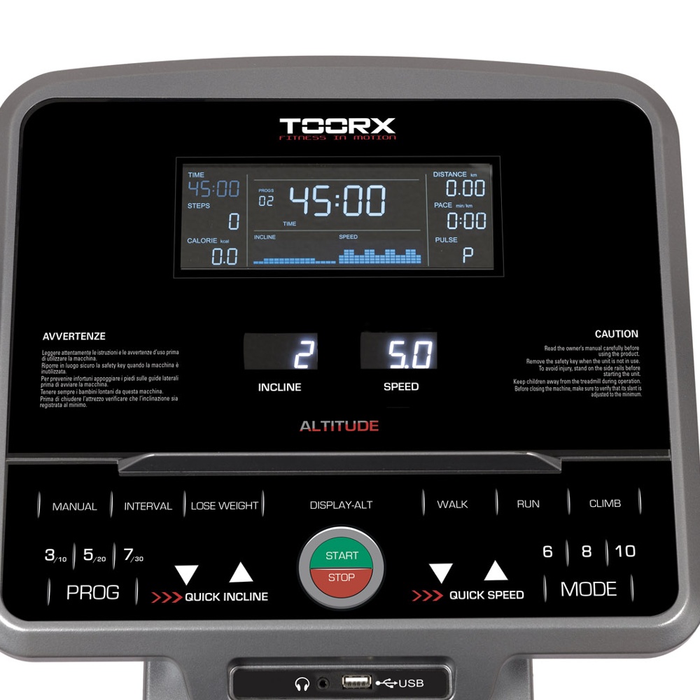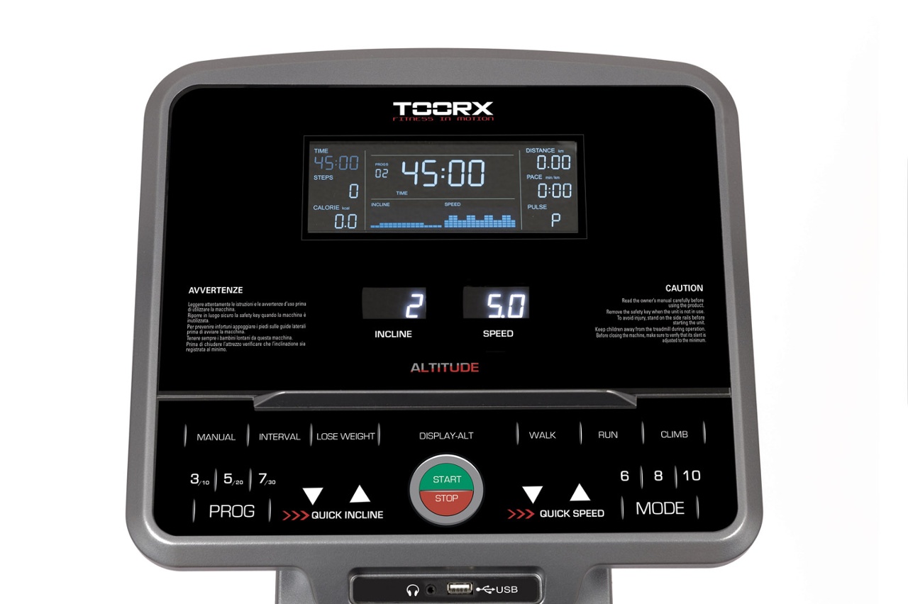 Performante e versatile tapis roulant a marchio Toorx, dotato sia della modalità RUN (velocità da 0,8 a 18 km/h e pendenza da -2% a +15 %) che della modalità CLIMB (velocità da 0,8 a 6 km/h e pendenza da -2% a +36%), per garantire un’esperienza di allenamento confacente alle esigenze di ogni tipologia di atleta.