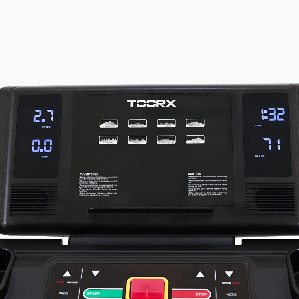 velocità, inclinazione, frequenza cardiaca, distanza, tempo, consumo calorico |